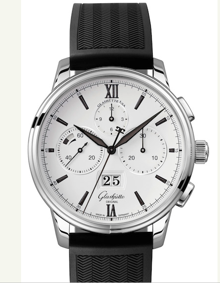 格拉苏蒂原创议员大日历计时腕表 新款精钢议员大日历计时腕表,白色的表盘映衬出深黑色的细节,典雅、亮眼的黑白对比及其摩登现代的外观设计带着一种绅士独有的克制。黑色时针、分针和停秒秒针、刻度以及6点与12点位置的罗马数字均涂有Super-LumiNova超级夜光涂层,在夜间发出浅灰色光芒,提供最佳夜间读时清晰度。