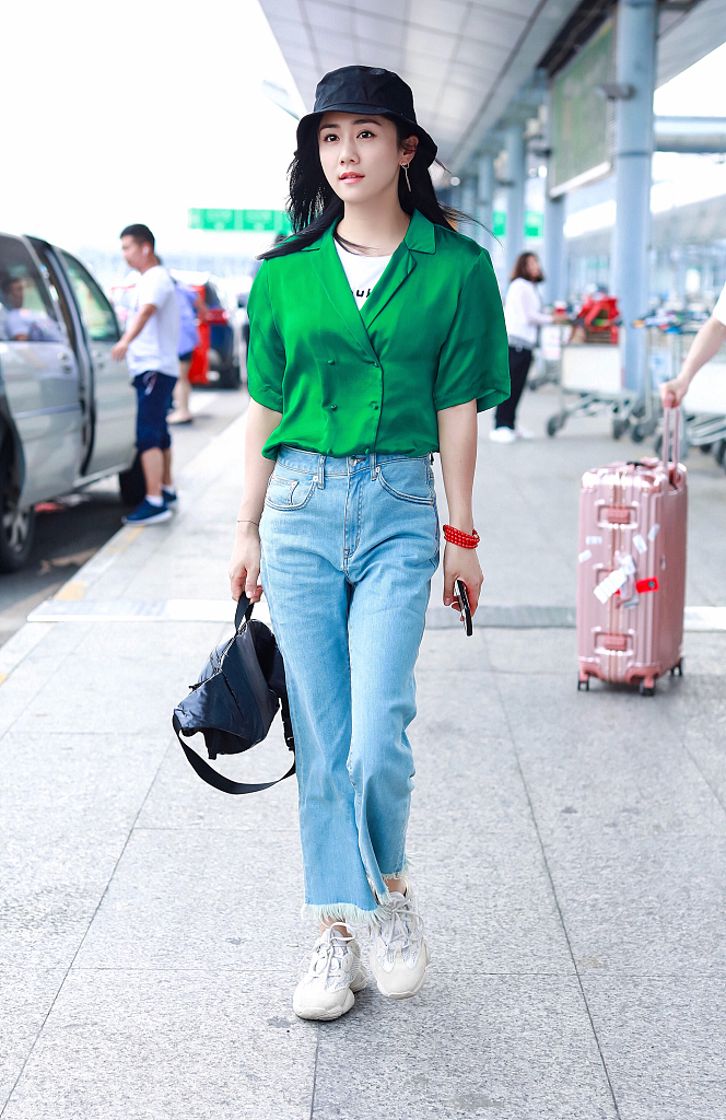 张俪 刘芸则身穿草木绿衬衫清新亮眼,Supreme腰包Yeezy 500老爹鞋又将她衬托的运动少女味儿十足!