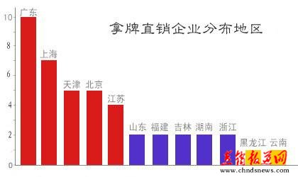 此外就直销企业分布的区域来看(中国台湾、中国香港、中国澳门地区不做统计),目前分布在我国17个省、市、自治区,沿海经济发达地区仍旧是直销企业分布的重地。 不过,随着这两年拿牌和申请直销牌照的企业增多,地域格局也逐渐发生变化:中部直销企业开始增多,目前位于中部的直销企业已达7家,有5家企业已获得了直 销牌照;西部本土也已经产生两家直销企业,并且其中一家企业也已获得直销牌照。直销企业占的比重为54.8%,还有近一半的地区尚无直销企业。其中,东部 地区只有广西暂无直销企业;中部地区山西、安徽、江西、河南、湖北尚无直销企业;西部地区重庆、贵州、西藏、陕西、甘肃、宁夏、青海、新疆暂无直销企业。 1-广东-10(直企数量,下同) 2-上海-7 3-天津-5 4北京-5 5-江苏-4 6-山东-2 7-福建-2 8-吉林-2 9-湖南-2 10-浙江-2 11-黑龙江-1 12-云南-1 |