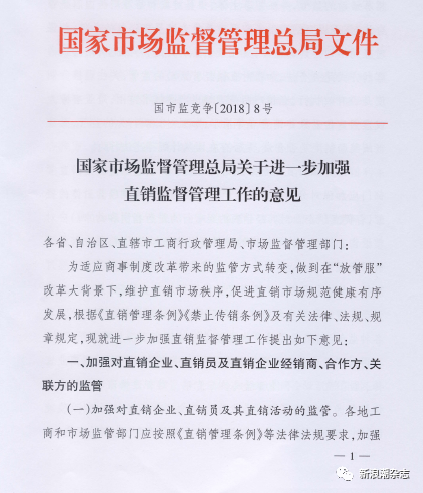 据了解,《直销管理条例》已走过16个年头,对直销企业以及直销员的经营行为准则有明确规定。虽然经销商是一个显而易见的存在,但政府文件中并无相关表述,从而缺乏对经销商的制约。直到2018年市场监管总局印发《国家市场监督管理总局关于进一步加强直销监督管理工作的意见》(业内称为“8号文”),才首次明确要求直企对经销商加强监管,“各地工商和市场监管部门应加强对分销直销企业产品的经销商及各类经营主体的监管,督促直销企业对其经销商的经营行为进行指引和约束。”