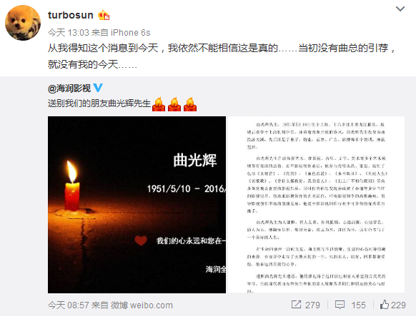 【直报网北京7月8日讯】(新浪娱乐)7月8日下午,孙俪[微博]通过微博深情表达了对制作人曲光辉先生知遇之恩的感激之情,她发文道:“从我得知这个消息到今天,我依然不能相信这是真的……当初没有曲总的引荐,就没有我的今天……”随后黄奕[微博]也发文称:“从董竹君里的小演员到世纪末的晚钟,再到长恨歌,曲总不仅带给我们那么多好作品,更重要的是像一位贴心的兄长、家人。无法用语言来形容心中的难过,一路走来的所有都铭记在心,一路走好。” 2016年7月5日,曾制作过《玉观音》、《永不瞑目》、《北上广不相信眼泪》等优秀电视剧的著名制作人曲光辉在旧金山因病逝世,享年65岁。7月8日上午,海润影视公司在微博上发布了一则纪念曲光辉先生的文章,不仅赞赏了他在世时为人胸怀信仰、济世为怀,并祝福他在天国一路走好。而曾经获得曲老引荐而出演《玉观音》的孙俪也于下午转发了该文章,以此表达自己对曲老的思念与感激之情。 ▲ (原标题:制作人曲光辉去世 孙俪黄奕发微博悼念) 责编:小美 解读新闻热点、呈现敏感事件、更多独家分析,尽在“直事儿”微信,扫描二维码免费阅读。
