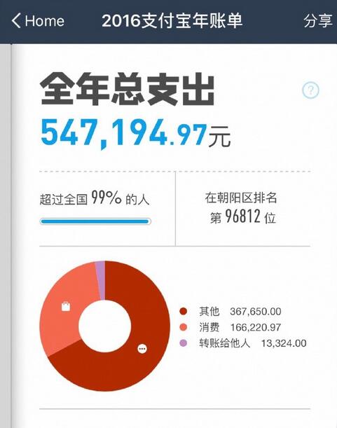 【直报网北京1月9日讯】(凤凰网娱乐)近日,每个人的朋友圈几乎都被支付宝年账单刷了屏,明星也不例外。1月8日,高晓松也晒出了一张个人年账单的截图,图片上显示高晓松一年竟花费了54.7万余元,超过了全国99%的用户,但在朝阳区仅排第96812位,高晓松自侃道:“朝阳群众太有钱了,差点被甩出十万名以外。” 在高晓松的账单中,“消费”一项占了16.6万,而“其他”一项则占了三分之二——将近36.7万元,高晓松表示这都是他给员工发红包的钱。 高晓松配文写道:“一个阿里人,到哪都坚持用支付宝,上至肯德基下至烤白薯都支付宝。一年下来发现自己花的没多少,账单里2/3的钱都用来给阿里员工发了红包。这是一种怎样的精神?是一种毫不利己专门利人的精神!这是一纯粹的人!一脱离了低级趣味的人!一有益于人民币的人!TMD朝阳群众太有钱了,差点被甩出十万名以外。” 网友纷纷围观并评论道:“50多万叫做没多少,老师,我们还是继续苟且吧”、“厉害了,我的朝阳区,主要是举报给的奖励多,一定是这样”,还有网友注意到了高晓松消费的那16万:“16万是吃了多少顿肯德基和烤白薯?”也有网友忙着抱大腿:“高老师还需要员工么,特能抢红包的那种!”▲ (原标题:高晓松一年花了54万 网友:吃的就占了16万?) 责编:小美 解读新闻热点、呈现敏感事件、更多独家分析,尽在以下微信公号,扫描二维码免费阅读。