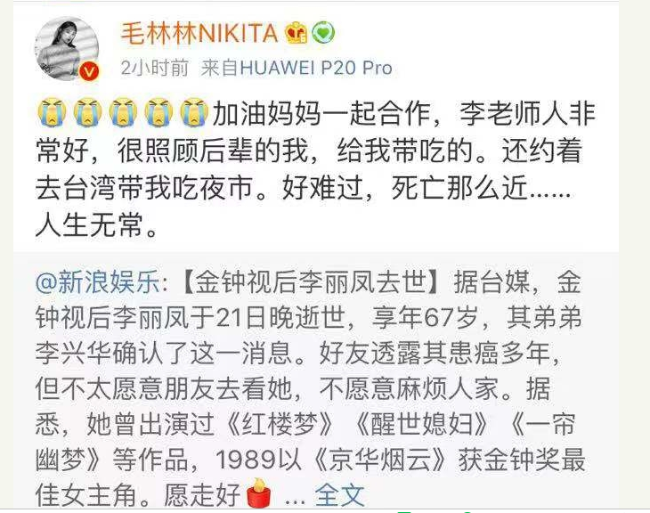 和她在《加油妈妈》中有过合作的女演员毛林林也发文悼念,在台湾拍戏的时候还带她去吃夜市,带好吃的东西给她,很照顾人,为人很友善。 |
