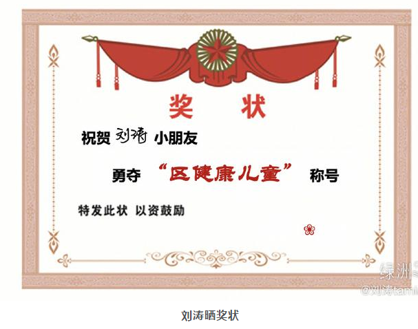【直报网北京10月22日讯】(新浪娱乐)在最新上线的《了不起的姐姐》中,刘涛[微博]自曝小时候吃面糊长大,所以身体好,三岁就被评为小区里的“健康儿童”。随后,刘涛还在绿洲晒出了一张奖状,上面写着:“祝贺刘涛小朋友勇夺区健康儿童称号”,自侃美丽健康从“嘴壮”开始,可爱满分。 (原标题:刘涛三岁被评为区健康儿童 晒奖状自侃“嘴壮”) 责编:小美 【特别声明:部分文字及图片来源于网络,仅供学习和交流使用,不具有任何商业用途,其目的在于传递更多的信息,并不代表本平台赞同其观点。版权归原作者所有,如涉版权或来源标注有误,请及时和我们取得联系,我们将迅速处理,谢谢!】 解读新闻热点、呈现敏感事件、更多独家分析,尽在以下微信公号,扫描二维码免费阅读。