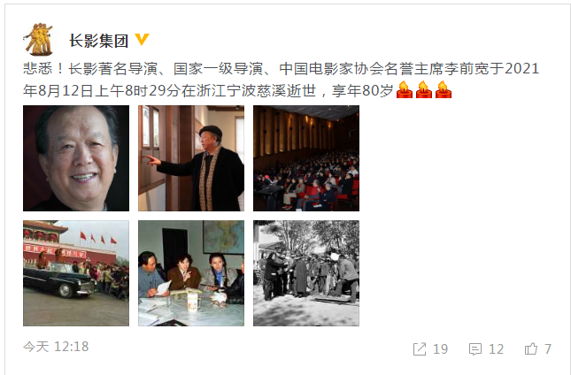 【直报网北京8月13日讯】(新浪娱乐)据长影集团官微消息,长影著名导演、国家一级导演、中国电影家协会名誉主席李前宽于2021年8月12日上午8时29分在浙江宁波慈溪逝世,享年80岁。 小陶虹发文悼念李导:“飞机降落打开手机,满屏都是您离开的消息,真的是太遗憾了。感谢您对中国电影所做的贡献,只要有您在的地方就充满了欢乐和能量!感恩您对后辈的提携和关爱,前宽导演一路走好……我们永远怀念您!”