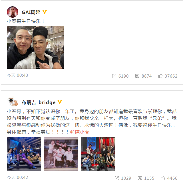 Gai晒出与搭着陈小春肩膀的合照,配文称:“小春哥生日快乐! ”。布瑞吉则晒出“哥哥”合影,并发文称:“小春哥,不知不觉认识你一年了。我身边的朋友都知道我最喜欢与崇拜你,我都没有想到有天和你变成了朋友,你和我父亲一样大。但你一直叫我“兄弟”。我很感恩与很感动你为我做的这一切。永远的大湾区!偶像,我要祝你生日快乐,身体健康,幸福美满!!!!” (原标题:大湾区偶像!Gai布瑞吉晒合影为陈小春庆生) 责编:小美 【特别声明:部分文字及图片来源于网络,仅供学习和交流使用,不具有任何商业用途,其目的在于传递更多的信息,并不代表本平台赞同其观点。版权归原作者所有,如涉版权或来源标注有误,请及时和我们取得联系,我们将迅速处理,谢谢!】 解读新闻热点、呈现敏感事件、更多独家分析,尽在以下微信公号,扫描二维码免费阅读。