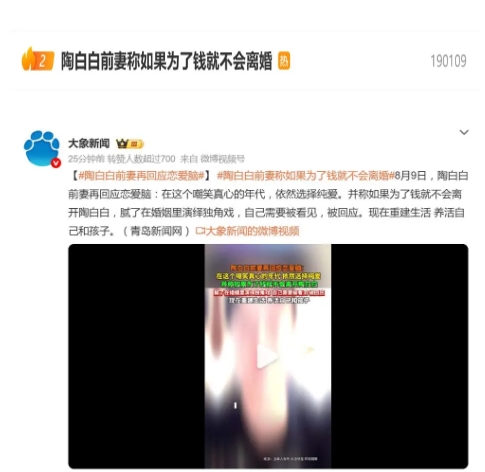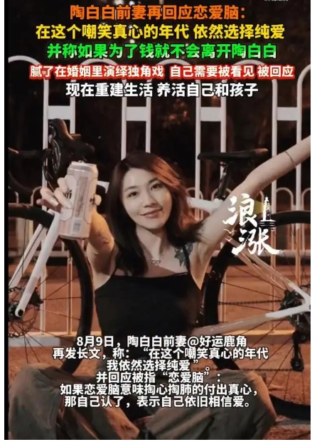 【直报网北京8月11日讯】(搜狐体娱)8月9日,陶白白前妻鹿角再次回应离婚争议,直言“如果为了钱,就不会在他一无所有时嫁给他,更不会在他事业巅峰时离开”。这番剖白,直接撕碎了外界“捞女”的质疑,也让这场婚姻的真相浮出水面——不是钱的问题,而是“情感供需严重错配”。