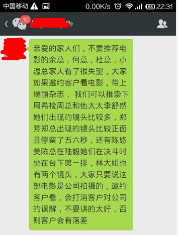 道和影业南京有限公司在南京市工商局网站上的注册信息 为此,记者查阅了南京市工商局网站(上图),发现确有一家名为“道和影业南京有限公司”的注册企业,其成立时间为2013年7月18日,这一时间仅仅比《英雄之战》公布的开机日期早了一个多月,而这家公司的“法定代表人”正是《英雄之战》的导演虞军豪。如果判断中脉道和就是为拍《英雄之战》才成立一家影视公司也是不无道理的。 一位亲属曾深受其害的柳先生告诉记者,中脉此前曾宣称《英雄之战》售出了高达450万张的预售影票,而这一数字其实是夸大的,真正预售票数大概是100万张左右,而预购者全部来自片方自己,“说白了这就是自产自销,他们把票买回来在逐层分发给自己的下线,让下线发动自己的亲朋好友来看这部片子,同时让他们感染中脉文化。” 为了更好的解释什么是“感染中脉文化”,记者通过其他方式几番寻找联络,得到了某市中脉“二级代理”在微信群里传达高层旨意的信息截图(请先横向阅读第一行,再阅读第二行):