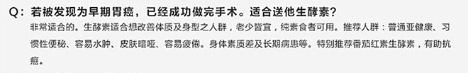 宣传中甚至提到“日本酵素”可以抗癌 找一堆蔬菜瓜果放在一起发酵产生的东西,你真的敢信它能治病?可是在虚假宣传下,它无所不能。特别是商家还充分地利用了一些消费者对于国外保健品的迷信心理。许多人赴日购买日本药,日本药也变为了安全、可靠、好用的代名词。而“酵素”正是大吹特吹自己来自日本。消费者只是依据以前对日本产品的认知进行判断,殊不知日本对“酵素”产品的监管并不积极。 |