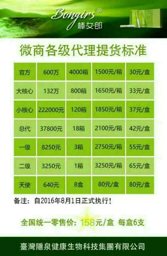 ![]() 以棒女郎为例,根据2016年8月涨价后的标准,要成为“官方”级别的代理,需交600万,每盒仅30元;入门级别“天使”,需交640元,每盒80元。 柏勇公开的入货发票也证明了这一点。发票显示,棒女郎的出厂单价为12元,而作为总代的他拿货价为42元/盒,入门级别的“天使”拿货价为80元/盒。售价一样,只有交更多的钱以更便宜的价格拿货,才能赚取最大的差价。 |