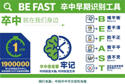 【直报网北京10月29日讯】(和治友德)今天是第20个世界卒中日。今年,世界卒中组织(WSO)确定的全球核心口号为:“Every Minute Counts. Know the signs of stroke. Act FAST.”(分秒必争,识别卒中,快速行动)。 作为人类健康的头号杀手,卒中(俗称中风或脑血管病)以惊人的破坏力威胁全球——这种急性脑血管循环障碍性疾病,其致死率、致残率和复发率均居我国慢性病前列。更触目惊心的是,全球每4人中就有1人终身面临卒中风险,每6秒就有1人因此丧生,同时另有1人永久性残疾。 截至2025年9月,我国现有脑卒中(俗称“中风”)患者总数超过2800万,其中40岁及以上人群现有患者达1242万。 脑卒中患者数量呈现年轻化趋势,我国25岁以上人群的终生患病风险为接近40%,即约四成人从25岁起可能发生脑卒中。我国每年因脑卒中死亡约154万人。 1 及时发现快速识别 卒中发作时,每分钟约有190万个脑细胞因缺血缺氧而死亡,随之导致运动、语言、认知及情感等神经功能不可逆的损伤。但临床研究表明,若能在发病4~5小时内到达具备卒中救治资质的医院接受规范治疗,约70%患者可实现显著功能恢复。每延迟1分钟治疗,患者大脑相当于加速衰老3.6年。因此,一旦发现疑似症状,必须争分夺秒送医。 中国卒中学会在第七次学术年会期间正式发布了识别卒中早期症状的“BE FAST口诀”,前5个字母各代表一个早期症状,最后1个字母是提醒一旦发现卒中症状,就要马上拨打急救电话,立刻就医: ![]() “B”——Balance是指平衡,平衡或协调能力丧失,突然出现行走困难; “E”——Eyes是指眼睛,突发的视力变化,视物困难; “F”——Face是指面部,面部不对称,口角歪斜; “A”——Arms是指手臂,手臂突然无力感或麻木感,通常出现在身体一侧; “S”——Speech是指语言,说话含混、不能理解别人的语言; “T”——Time是指时间,上述症状提示可能出现卒中,请勿等待症状自行消失,立即拨打120获得医疗救助。 2 健康生活预防卒中 饮食 少盐控油 合理饮食 预防卒中需从饮食管理入手:每日膳食应包含丰富多样的新鲜蔬果,确保营养均衡;严格限制盐分摄入(每日≤5克),采用低油烹饪方式,同时控制胆固醇及碳水化合物的摄入量;此外,必须戒除饮酒习惯。 运动 日常锻炼 适量运动 对于有高血压的人群来讲,如快跑、对抗性较强的足球、篮球比赛等剧烈运动需要慎重参与,建议有脑卒中发病风险的人群,选择慢走、慢跑、游泳、太极拳等项目。建议日常加强体育锻炼,每天运动时间不少于30分钟,每周总时间不少于150分钟。 睡眠 避免熬夜 充足睡眠 研究表明,睡眠时长与脑卒中风险呈正相关。相比每晚睡7-8小时的人,睡眠不足6小时的中老年人卒中风险增加4倍,而失眠者的风险更是显著高于睡眠正常者。因此,保证充足且优质的睡眠对降低卒中风险至关重要。 ![]() 体检 定期监测 积极治疗 研究表明,高血压、血脂异常和糖尿病是卒中的重要危险因素。建议定期体检,对可能引发卒中的异常指标进行持续监测;确诊糖尿病、高血压或高血脂的患者应及时接受规范治疗,以降低心血管风险并预防卒中发生。 心理 神情畅达 心境坦然